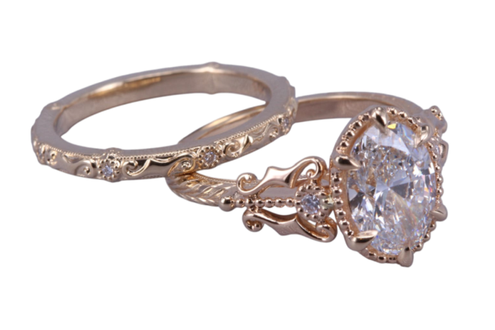 A combination engagement ring and floral wedding band with milgrained edges, set with a rare "rootbeer" diamond